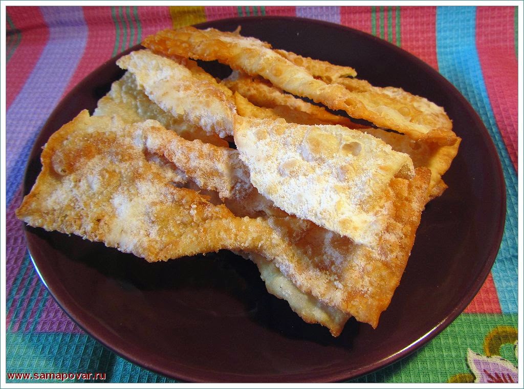 На 200г пшеничной муки – 1 яйцо, 0,5 стакана 20% сметаны, 1 ст. л. сахарного песка, цедра 1 лимона, 2 ст. л. водки. Растительное масло без запаха для фритюра.