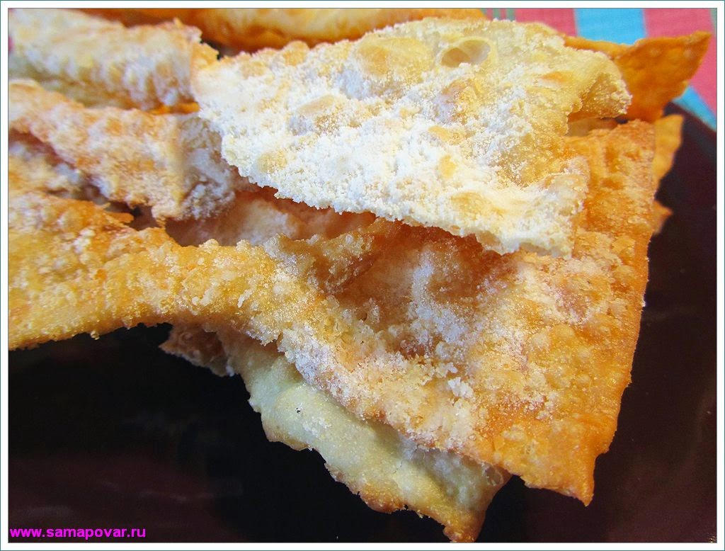 Жарить в большом количестве разогретого масла до румяности. Периодически масло меняйте не жалея, иначе хворост будет подгорать и горчить. Готовое печенье остудить и посыпать сахарной пудрой.