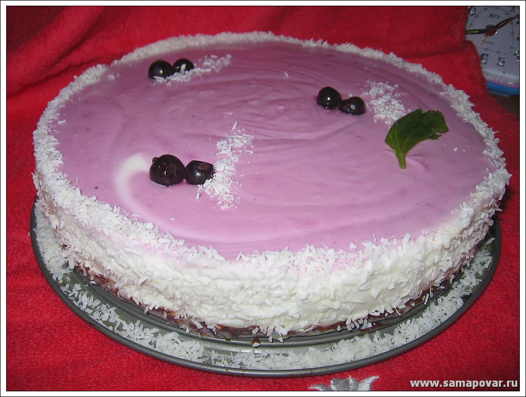 Утром снять бока формы и обсыпать бока кокосовой стружкой, слегка прижимая ее к торту. Украсить листиками мяты и ягодами.